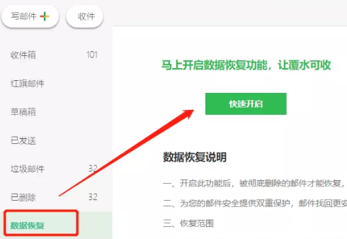 如未开启此功能,登录邮箱后,在左侧找到【数据恢复】,点击【开启此功能】后彻底删除的邮件才可通过此功能恢复。