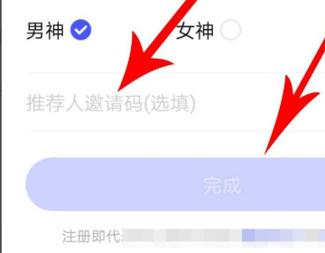 4、进入到下一页后,填写昵称和点选性别,接着就是要找的填写邀请码的位置了(见下图),填写完毕后点击“完成”,就可以了。