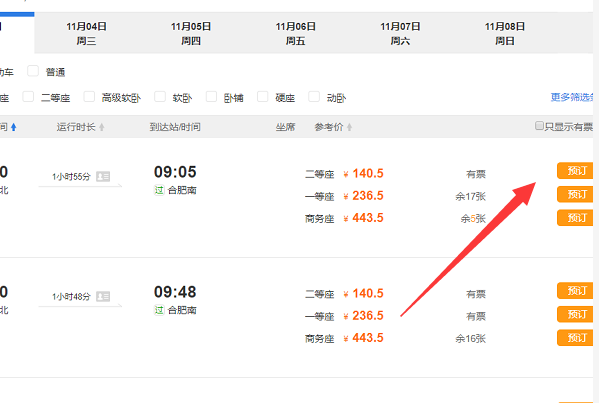 4、在出现的火车票搜索结果页面中点击需要的火车票后面的预定按钮。