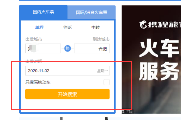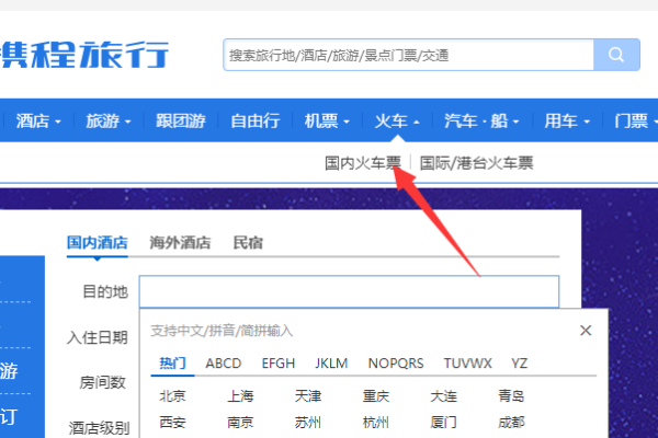 2、进入到携程官网以后点击火车下面的国内火车票进入。