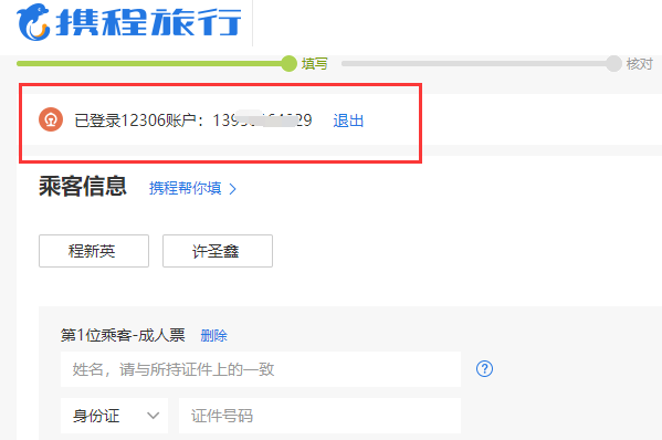 7、此时可以在页面中看到已经使用12306的账号登录了携程网站了且可以看到当前登录的账号提示消息。