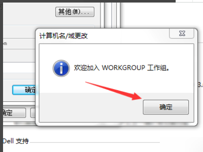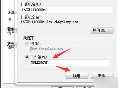 3、弹出计算机名/域更改对话框,在该对话框中点击工作组,输入workgroup,并点击确定。