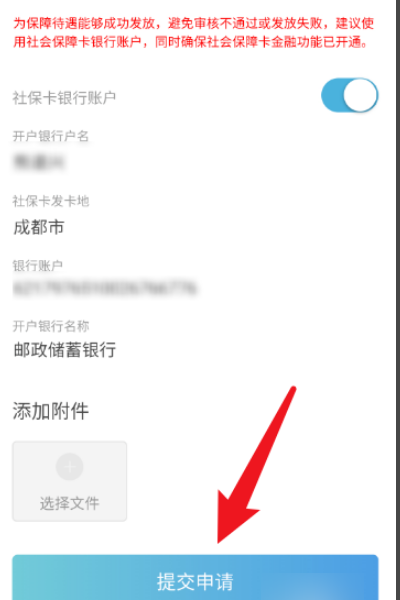 14、最后在页面核对社保银行账户信息,并点击提交申请。提交的申请待社保局审核通过后,会将失业补助金划拨到你的社保银行账户。