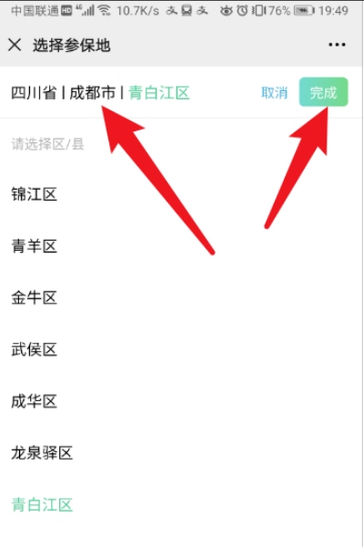 11、在工具栏选择你所在的参保地。在此以成都市青白江区为例。并点击后面的完成。