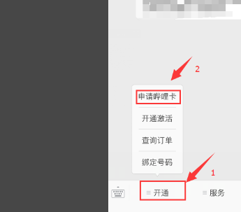 三、进入公众号页面后,选择“开通”>>“申请哔哩卡”;