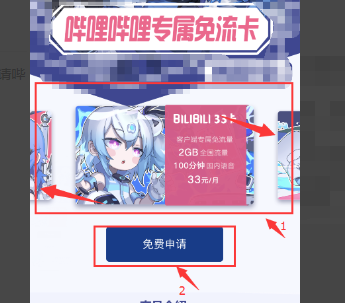 四、选择所需要办理的哔哩哔哩卡(哔哩哔哩22卡或哔哩哔哩33卡或哔哩哔哩小电视卡)后,选择“免费申请“;