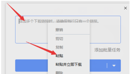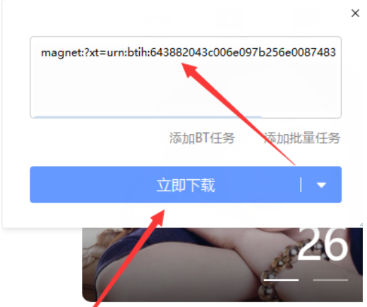三、打开“+”之后,如下图所示,需要在图中箭头指示处,输入磁力链接;