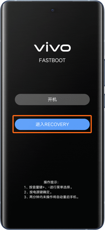 2017年9月后上市机型以及后续上市新机型(X20以及之后机型):关机状态按"电源键"和"音量上键"进入fastboot模式,再通过菜单选择进入recovery模式;