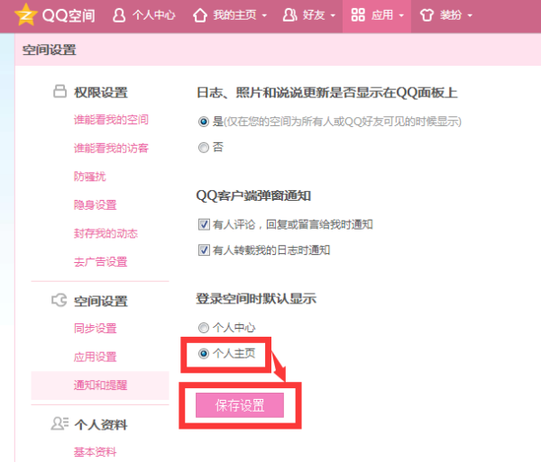 在“登陆空间时默认显示”一栏下,点击选中“个人主页”,再点击“保存设置”即可。
