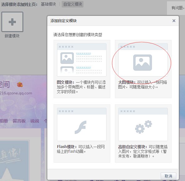 4.点击左侧“增删模块-自定义模块-新建模块”,弹出对话框,选择“大图模块”。