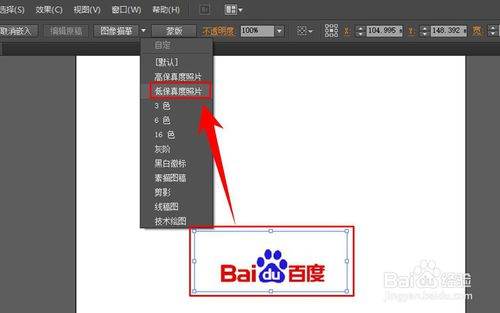 logo被打开后,在ai软件上方的工具栏中点击【图像描摹】右侧的下拉箭头,然后在其下拉菜单中选择【低保真照片】。注意,不是选择高保真,如果选择高保真的话,图片会非常模糊。
