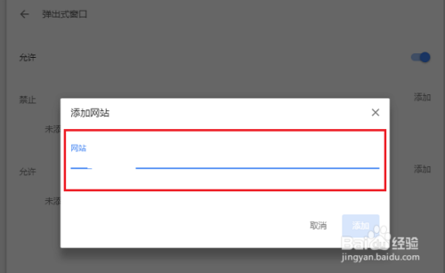 第六步如果我们想禁用一些网站弹出窗口,可以在禁止下面添加地址,可以阻止特定的网站弹出窗口,如下图所示: