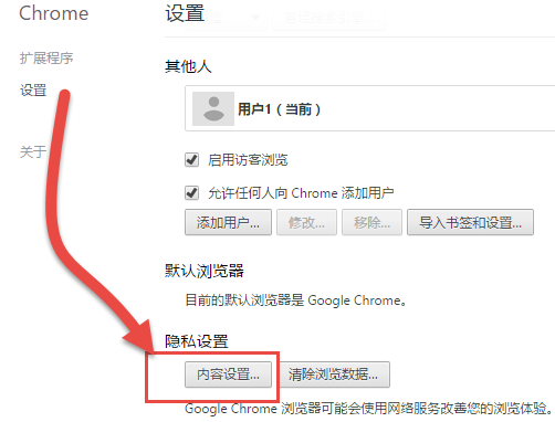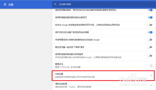 第三步进去高级设置中,在隐私设置和安全性的下面找到内容设置,点击进去,如下图所示: