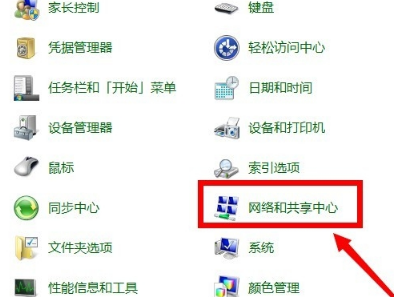 2、完成以上步骤后,在控制面板里面滚动,找到“网络和共享中心”,点击它。