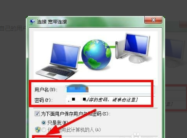 5、在“连接宽带连接”里输入自己的用户名和密码,点击“连接”按钮就可以上网了。