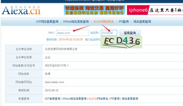 在新打开的页面上的查询框输入需要查询的域名,之后再输入验证码(输入验证码查询到的是最新数据,如果不输入验证码,查询到的只是缓存数据 ),点击“备案查询”按钮,就会显示该域名的有关信息。