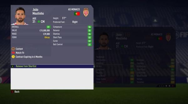 玩家们需要知晓的信息:正如大家所预料的那样,葡萄牙球星穆蒂尼奥依旧是FIFA18中一名顶级球员。这名摩纳哥中场今年在FIFA18中的总体评分为82,穆蒂尼奥的沉着数值(这个能力值类似于一个心态属性,数值越高表现越好,尤其是落后的情况下)为86,耐力值为84,还有一系列出色的技能属性。穆蒂尼奥的国际队出场次数超过了100次,而且还赢得了欧洲杯的冠军,如果你忽视了他,那么你真的是疯了。