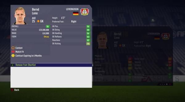 玩家们需要知晓的信息:能力值为85的德国门将莱诺会让玩家们有一些花费,但是他也是值得这个价钱的。莱诺的工资需求在8万英镑左右,这位勒沃库森门将拥有不俗的潜力,总体评分可以达到88。莱诺的站位值为85,鱼跃值为85,手型值为84,反应值为83,这位德国门将在FIFA18中已经成长为非常顶级的门将之一。