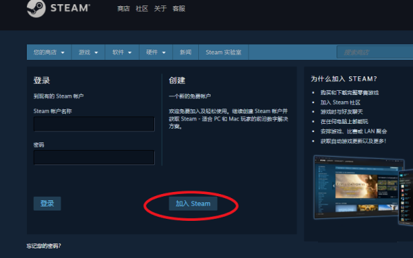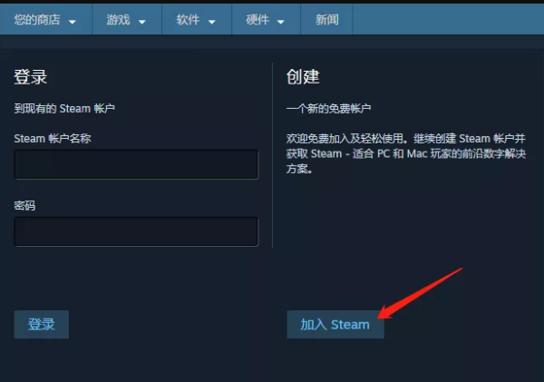 2、此时就进入到了登录页面了,在登录页面上还有一个账号创建栏,在账号创建栏下方点击【加入Steam】按钮。