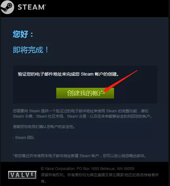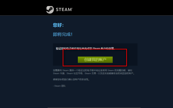 3、同时登录邮箱,在收到的steam邮件中,点击【创建我的账户】。