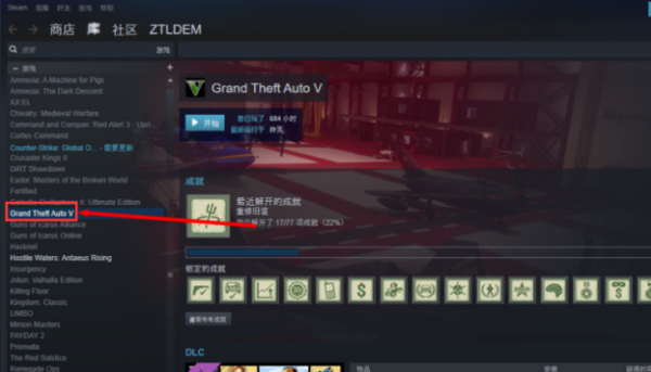 一、首先打开steam,在steam中找到GTA5游戏打开,如下图所示: