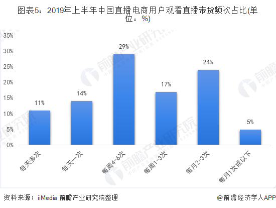 在直播电商的多重优势的驱动下,直播电商也逐渐走进消费者的生活。根据iiMedia数据显示,2019年上半年每周至少看一次直播电商的用户比例高达71%;而每天观看中国直播电商用户比例也已达到25%;可以看出直播电商模式的网络购物已经成为消费者日常消费的重要方式,其渗透率已经处于较高水平。