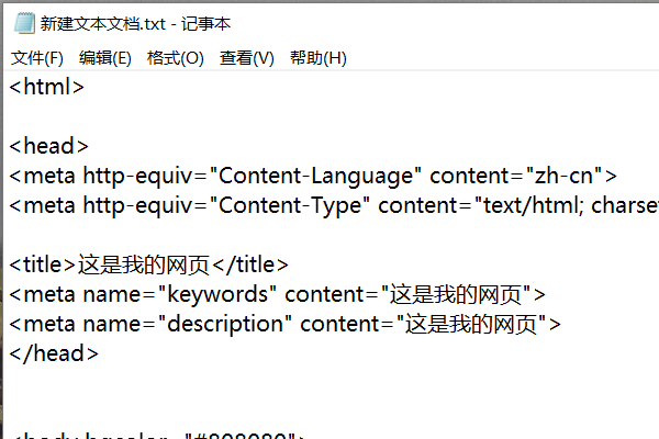 2,打开记事本文件之后,输入一些简单的html代码。输入之后,保存文件。
