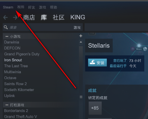 1、首先,登录你的steam账号并打开,在如下图中的界面中,点击左上角的“steam”按钮,进入下一步。