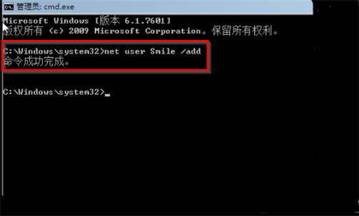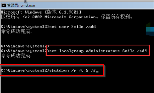 4、然后输入net localgroup administrators Smile /add然后按回车确定,命令成功后继续输入shutdown /r /t 5 /f回车确定。