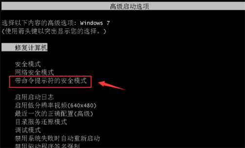 2、然后出现高级启动选项,通过键盘方向键上下选择,然后按“带命令提示符的安全模式”确定进入。