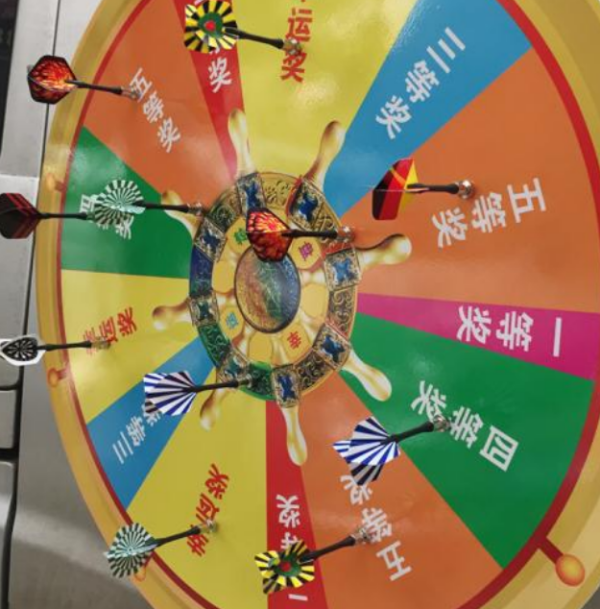 将飞镖制成火箭状,每个人的号码用标签做成骰子状粘贴在背景板上,年会的时候背景板缓缓转动,扎中的号码名字得奖,寓意“财路恒通”。
