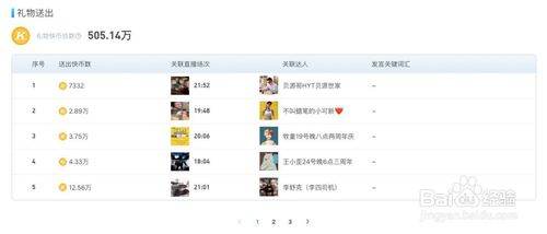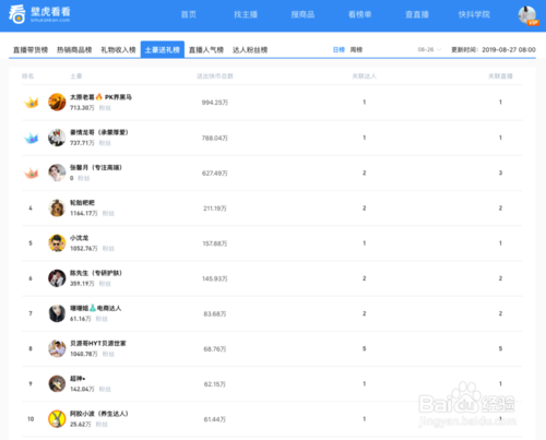 3、如果我们想知道有哪些人送过礼物,可以通过壁虎看看“土豪送礼榜”,帮助大家了解送出礼物快币总数最多的人是谁,并关联到相关的达人与直播。