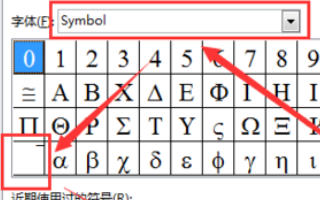 3、在“符号”对话框中,在“字体”一栏下拉选择“Symbol”,选择如图字符,点击“插入”,关闭对话框。