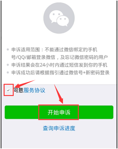 点击申诉的页面,在“同意服务协议”前面的小方框里点击打上勾。最后再点击“开始申诉”按钮,等后台处理后就可以找回微信账号了。