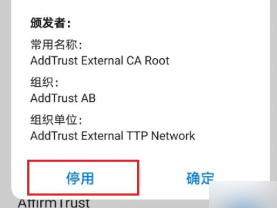 6、进入【受信任凭据】页面,选择具体的凭据选项后,长按并弹出安全证书信息页面,点击页面中【停用】按钮即可。如下图所示。