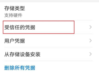 5、在【加密和凭据】页面,选择打开【受信任凭据】菜单选项,如下图所示。