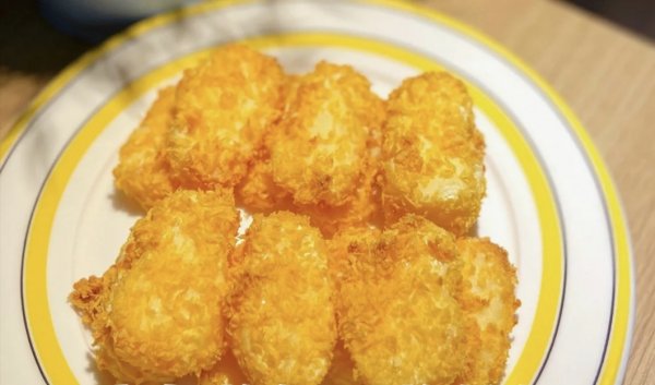 ③成膜后切块,依次沾玉米淀粉、鸡蛋液、面包糠,放入空气炸锅180度10分钟即可