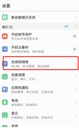 2、在“设置”应用软件的页面可看到名称为“无线和网络”的选项,点击“无线和网络”的选项打开。