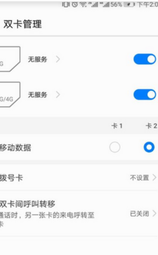 4、然后在“双卡管理”页面可以进行选择以后每次使用移动数据使用的是卡一或者卡二。
