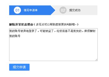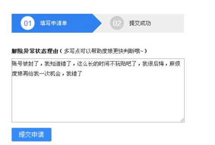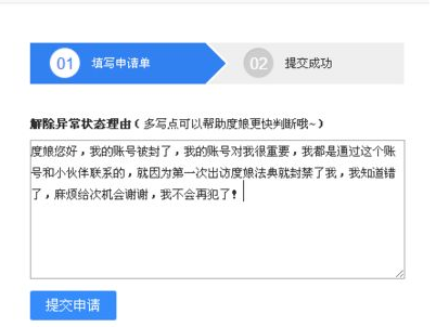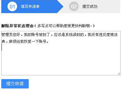 也是通过人工恢复,有时候你申请一次度娘还是没解封,那就申请第二次,申请理由:账号被封了,账号对很重要,都是通过这个账号和小伙伴联系的,就因为第一次出访度娘法典就封禁了,知道错了,麻烦给次机会谢谢。