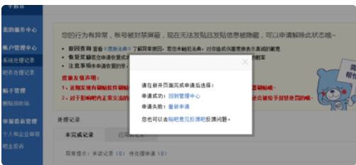 接下来系统会提示怎么操作以便完成整个解封过程。如果是永久封禁,在贴吧里申诉根本不可能,那只有点击申请失败,重新申请。