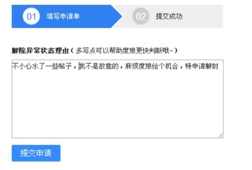 通过人工申请解封,如果是第一次发广告或水贴,水贴就是发表或回复大量无关的内容被封禁的,理由就写:管理员您好,不小心水了一些帖子,不是故意的,麻烦给个机会,特申请解封。