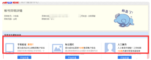 进入的页面提供给三个申请解禁的方法:手机验证、标注服务、人工服务
