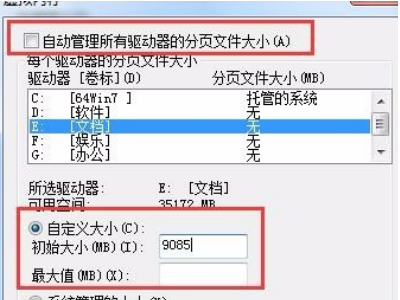 五、去掉“自动管理所有驱动器的分页文件大小”的“√”,选择一个盘符,可以设置成下面的推荐值。