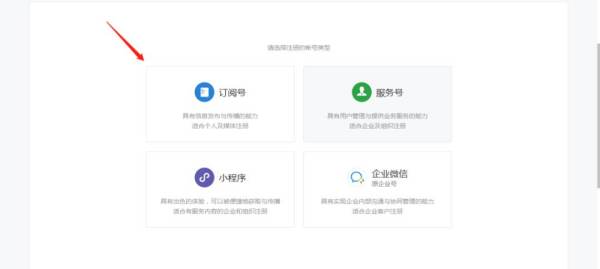 1、在注册之前,会出现一个界面,提示你选择“订阅号”、“服务号”“小程序”“企业微信”,公众号的类型只有两种,“订阅号”和“服务号”。