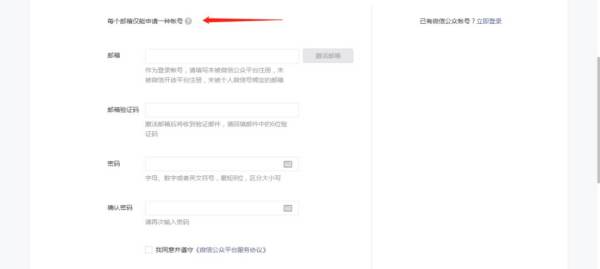 2、注册界面了,需要用邮箱申请,填写好邮箱之后,会有验证码,依次填写密码进入下一步。注册地只能是中国,这个没什么好说的,最后还会让你确认一遍公众号的类型。因为一旦选择之后,就不能更改的。