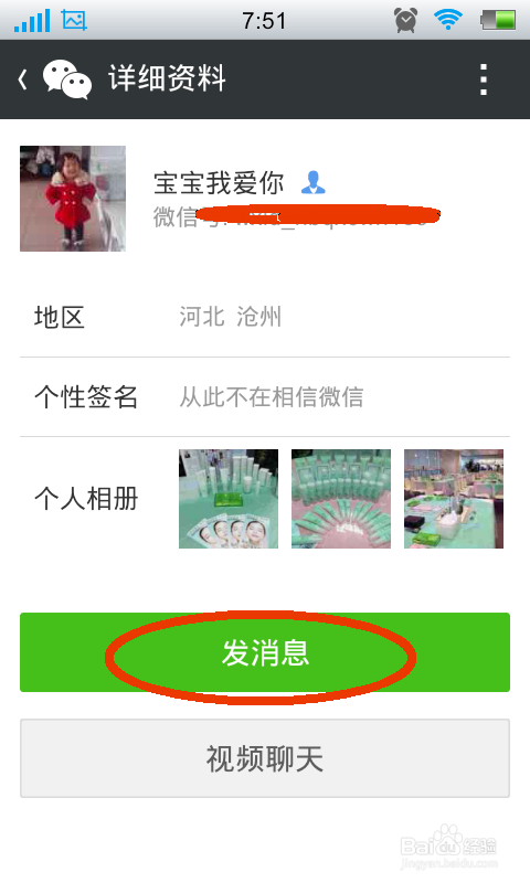 点击还有之后进入到还有的详细资料窗口,在窗口上面点击绿色的发消息按钮,如图所示: