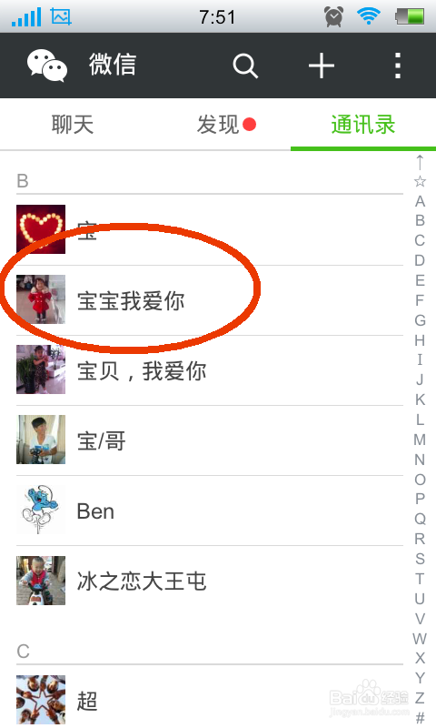 点击通讯录之后进入到通讯录窗口,在窗口上面点击要发送消息的好友,如图所示: