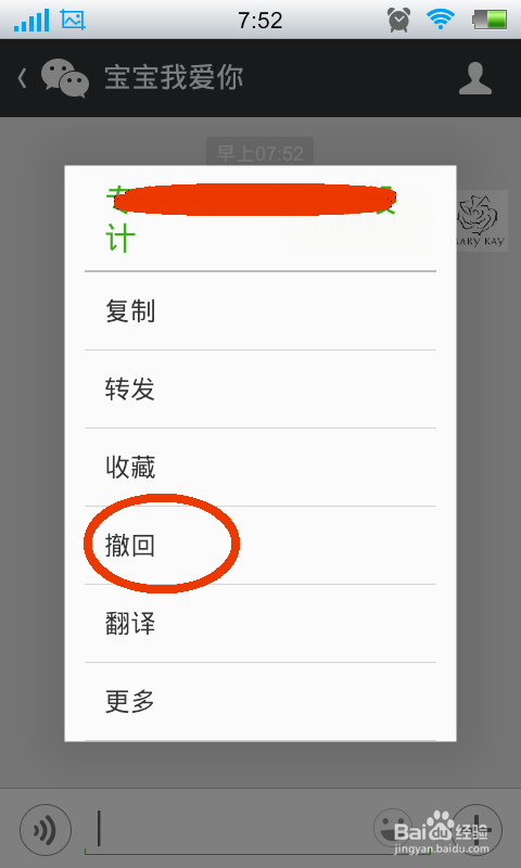 按住要撤回的消息之后会出现一个菜单,在菜单上面点击撤回,如图所示: