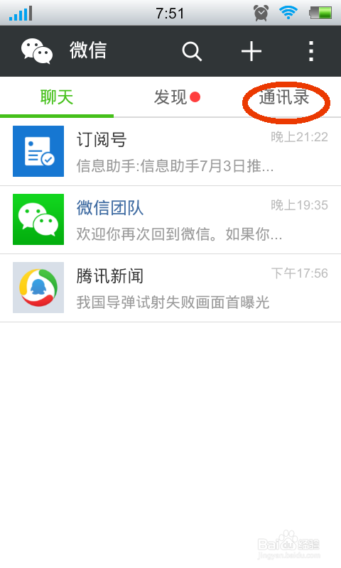 首先再手机上面登录到自己的微信账号,登录账号以后点击手机屏幕上面的通讯录,如图所示: